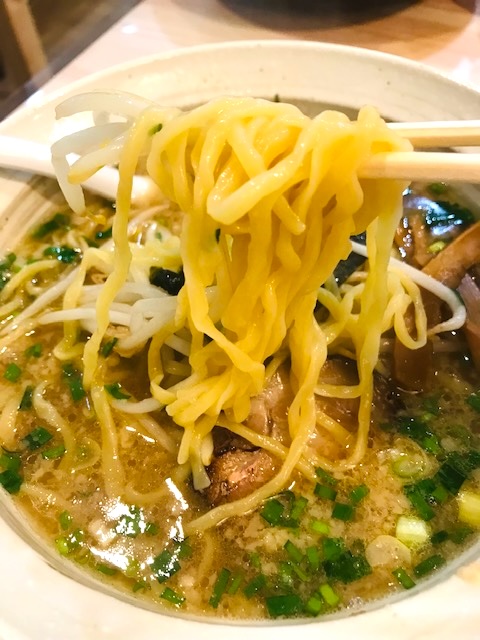 今年の夏にオープンしたとの事で店内はまだ新しくてカフェのように明るいです。濃厚仁家豚骨らぁ麺は、国産豚のゲンコツや鶏ガラで炊いたスープを使用しているそうで、背脂が浮いていますが意外とあっさりめの豚骨スープ。懐かしのちょっと平たい中太麺がすごく合います。